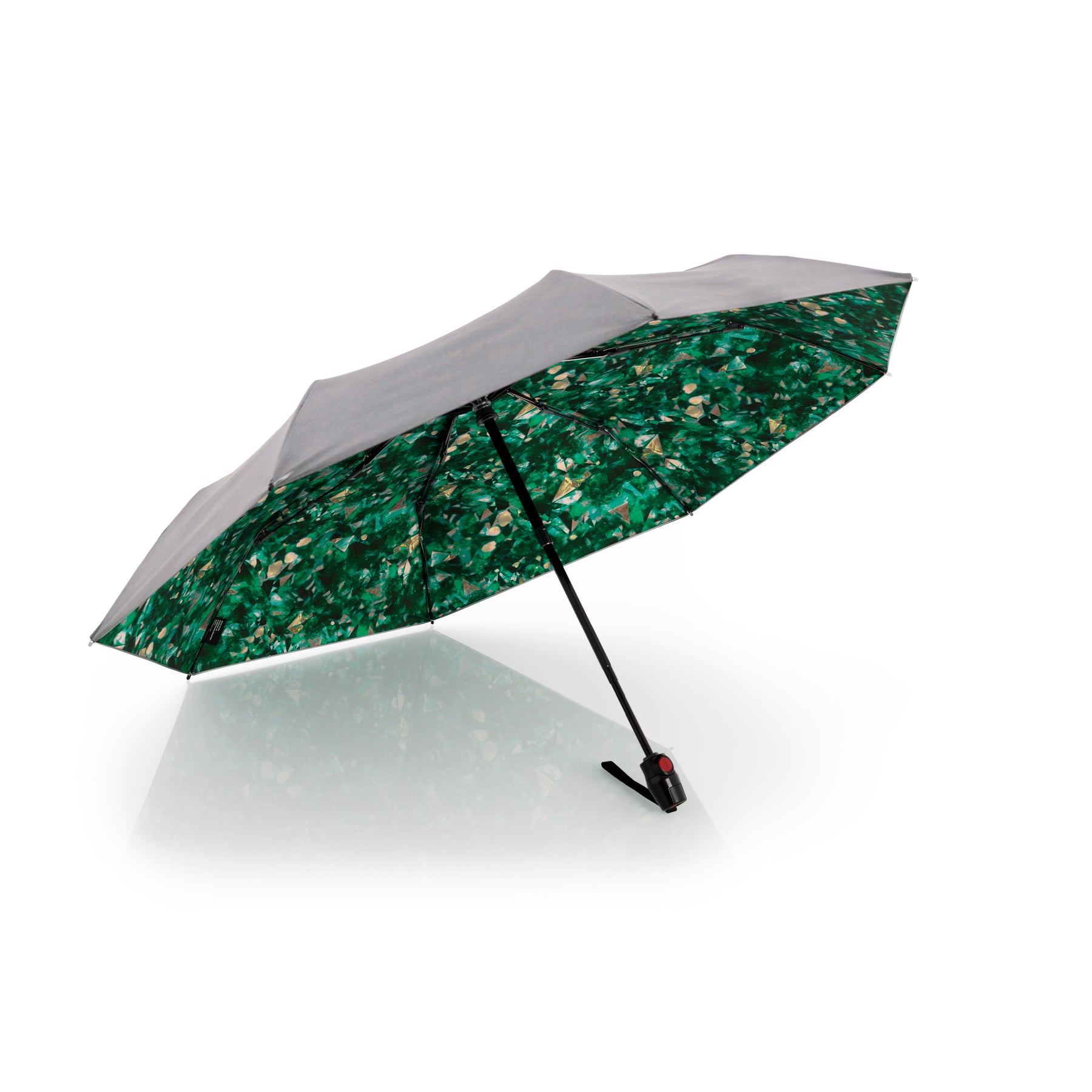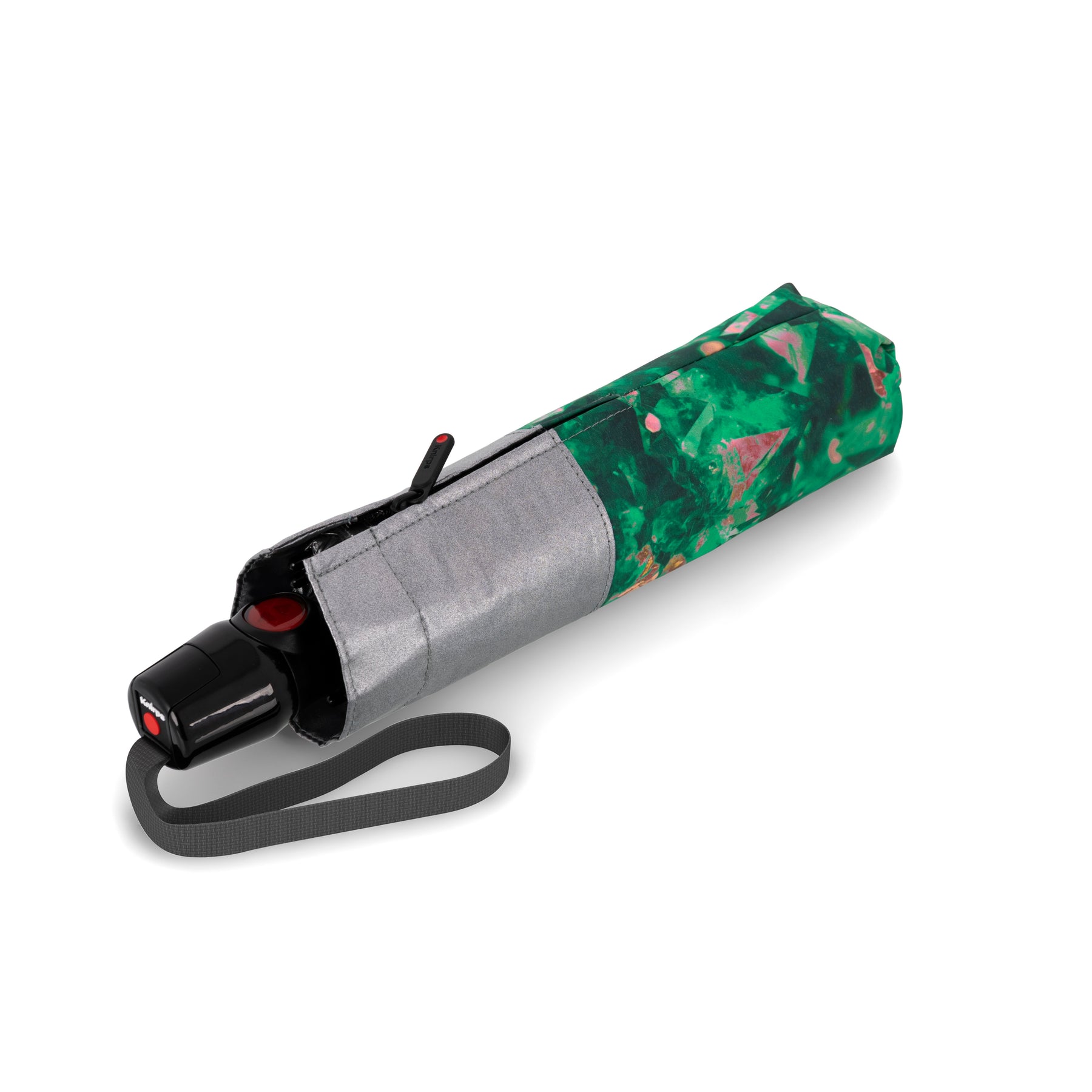 The T.200 Duomatic Folding Umbrella from German brand Knirps, is their most stable design. The practical Duomatic function guarantees easy and lightning-fast handling, as the umbrella can be opened or closed at the touch of only one button and the tripartite rails make it easy to fold the umbrella, so it can be stowed in your pocket in just a few seconds. Thanks to the use of the highest quality materials such as aluminium, steel and fibreglass and the precise workmanship, the T.200 is a true miracle of stability and can therefore withstand wind speeds of up to 150 km/h in the wind tunnel. Eight spokes guarantee additional stability in any wind direction. It comes with a protective zippered sleeve.